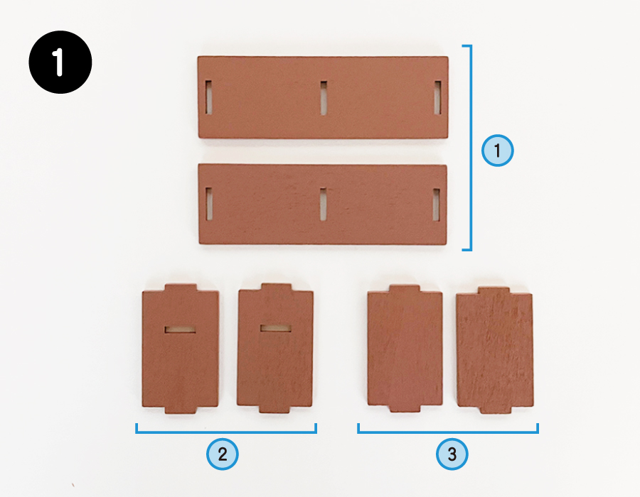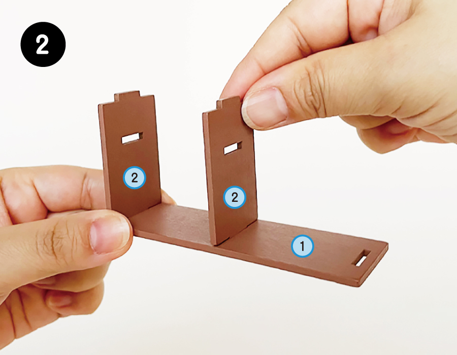 パーツ②の2枚をパーツ①の溝に写真の向きではめ込みます。