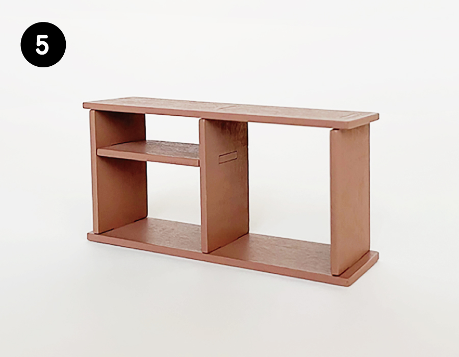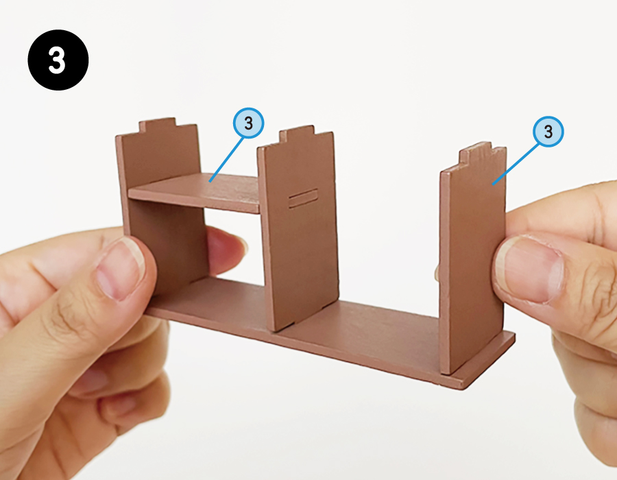 パーツ③の1枚を、❷で組み立てたパーツ②の溝にはめ込みます。もう1枚はパーツ①の残りの溝にはめ込みます。